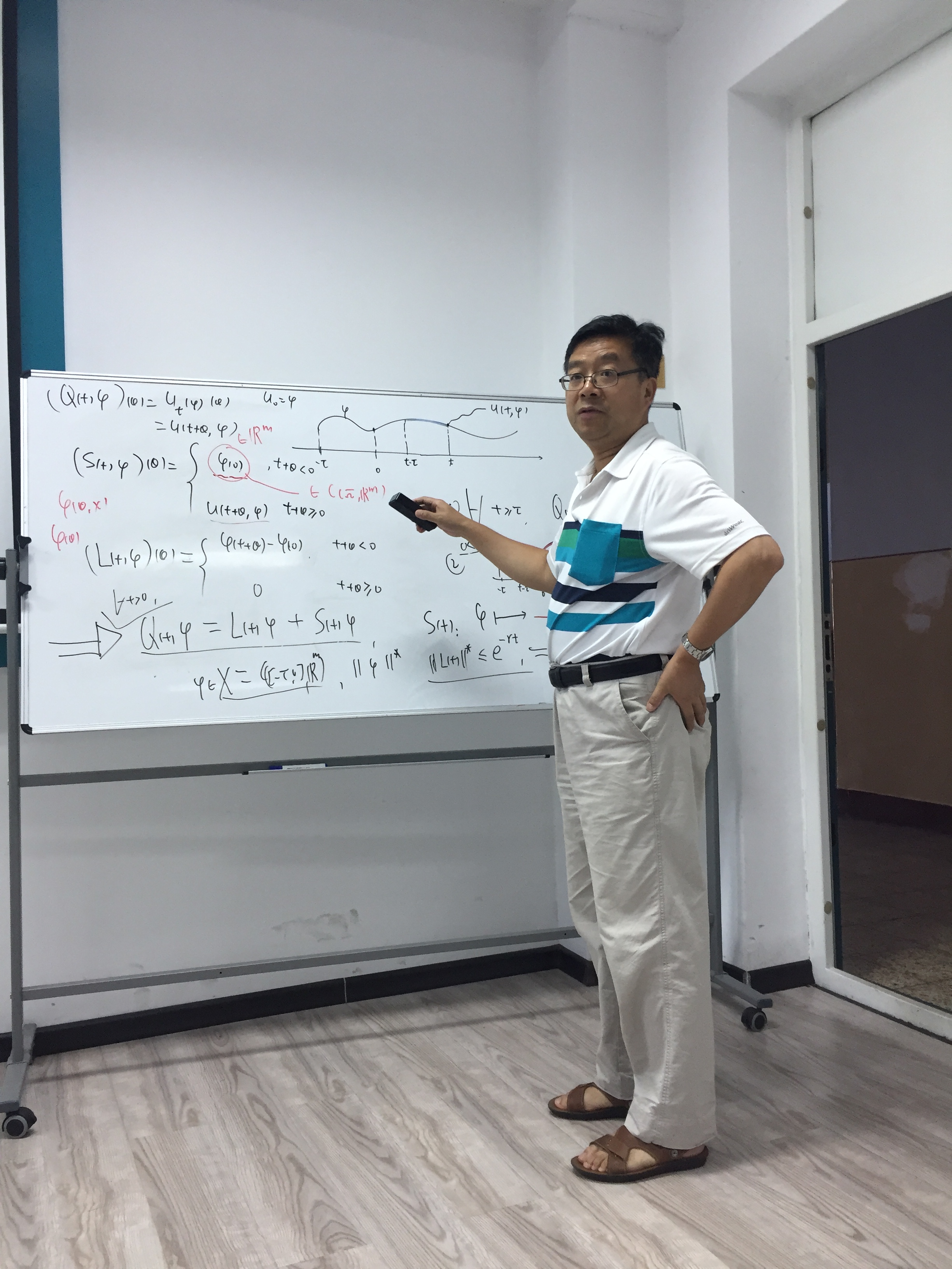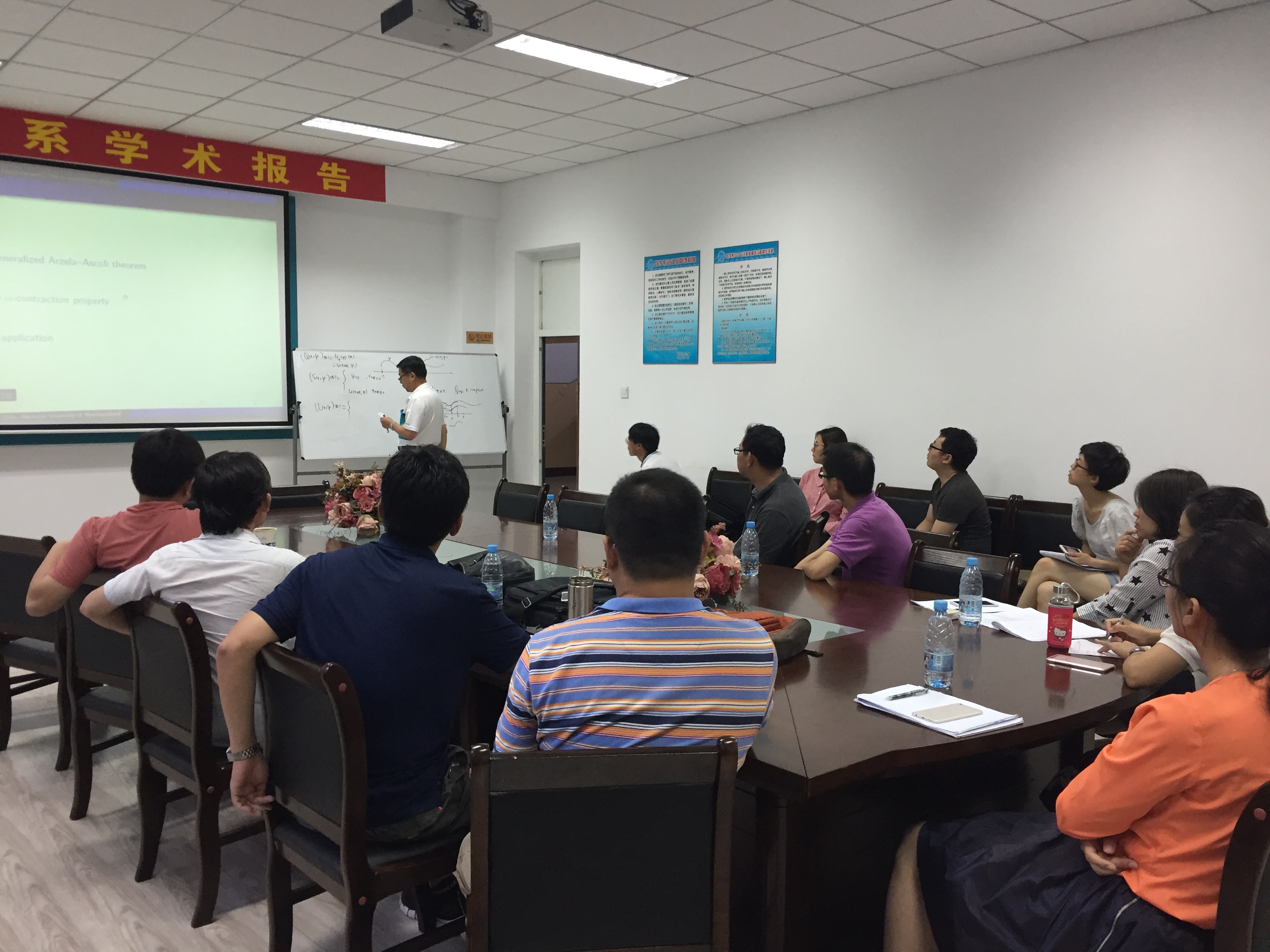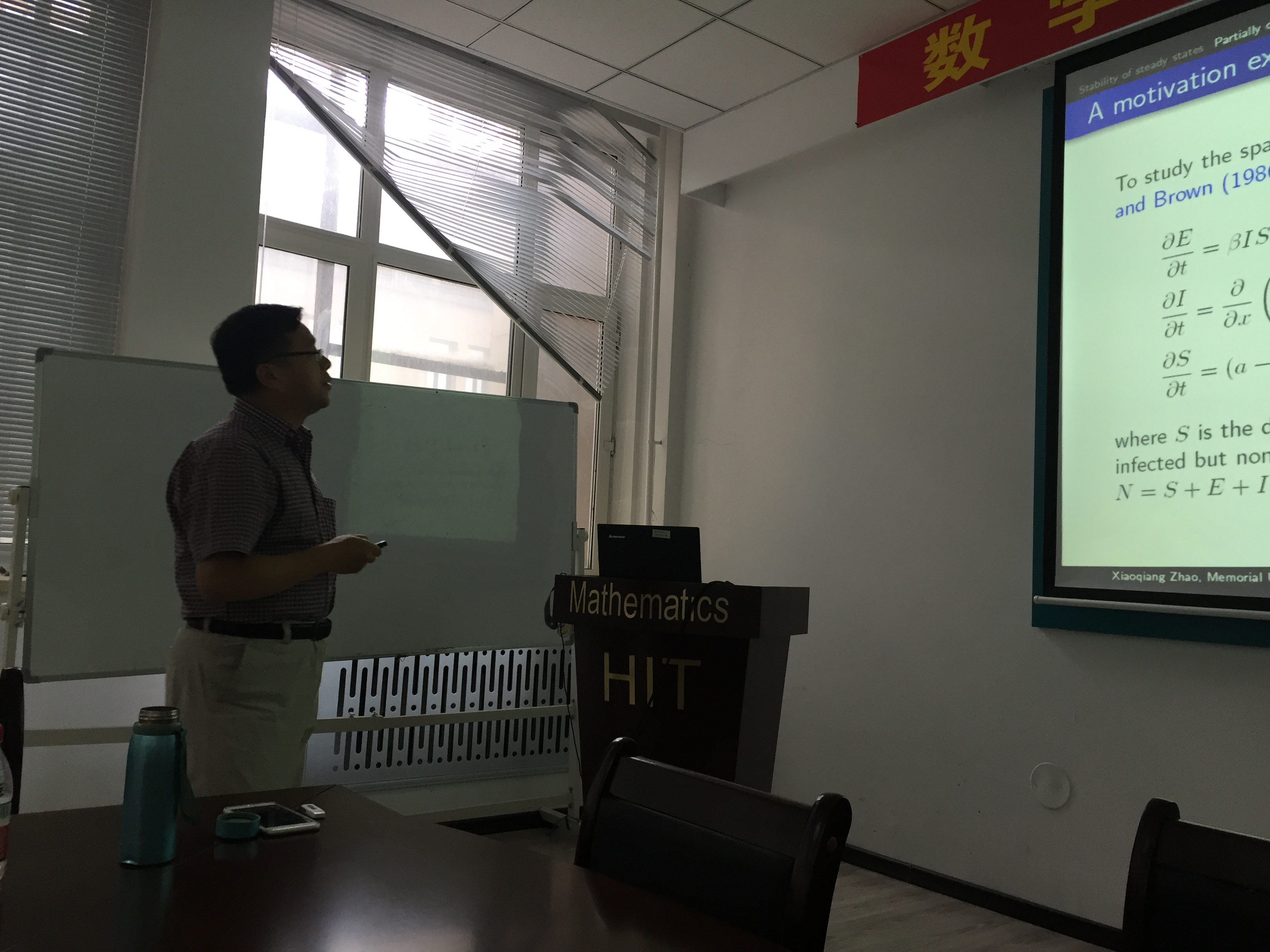 受国际合作处的资助,作为数学系SCI期刊编委校园行活动一部分,著名应用动力系统专家、加拿大纽芬兰纪念大学赵晓强教授应蒋卫华教授的邀请,于2017年7月1日至14日在必赢bwin线路检测中心官网数学系做访问交流。 赵晓强教授以反应扩散方程和动力系统研究中的几个热点问题为主题,在7日、9日、11日下午14:00-17:00,分别从反应扩散方程解的存在唯一性、正不变性、有界性、单调性等基本性质,稳定性与主特征值,吸引子和持久性,基本再生数,抽象泛函微分方程解映射的紧性等方面做了六个精彩的学术报告。报告由蒋卫华教授主持,相关专业的四十余位师生有幸参与讲座和讨论,报告也吸引了包括哈尔滨工程大学、哈尔滨师范大学、黑龙江大学、哈尔滨理工大学和东北林业大学的多位师生慕名前来参加。赵老师的系列报告系统、全面、细致、深入,师生们从中收获颇丰。