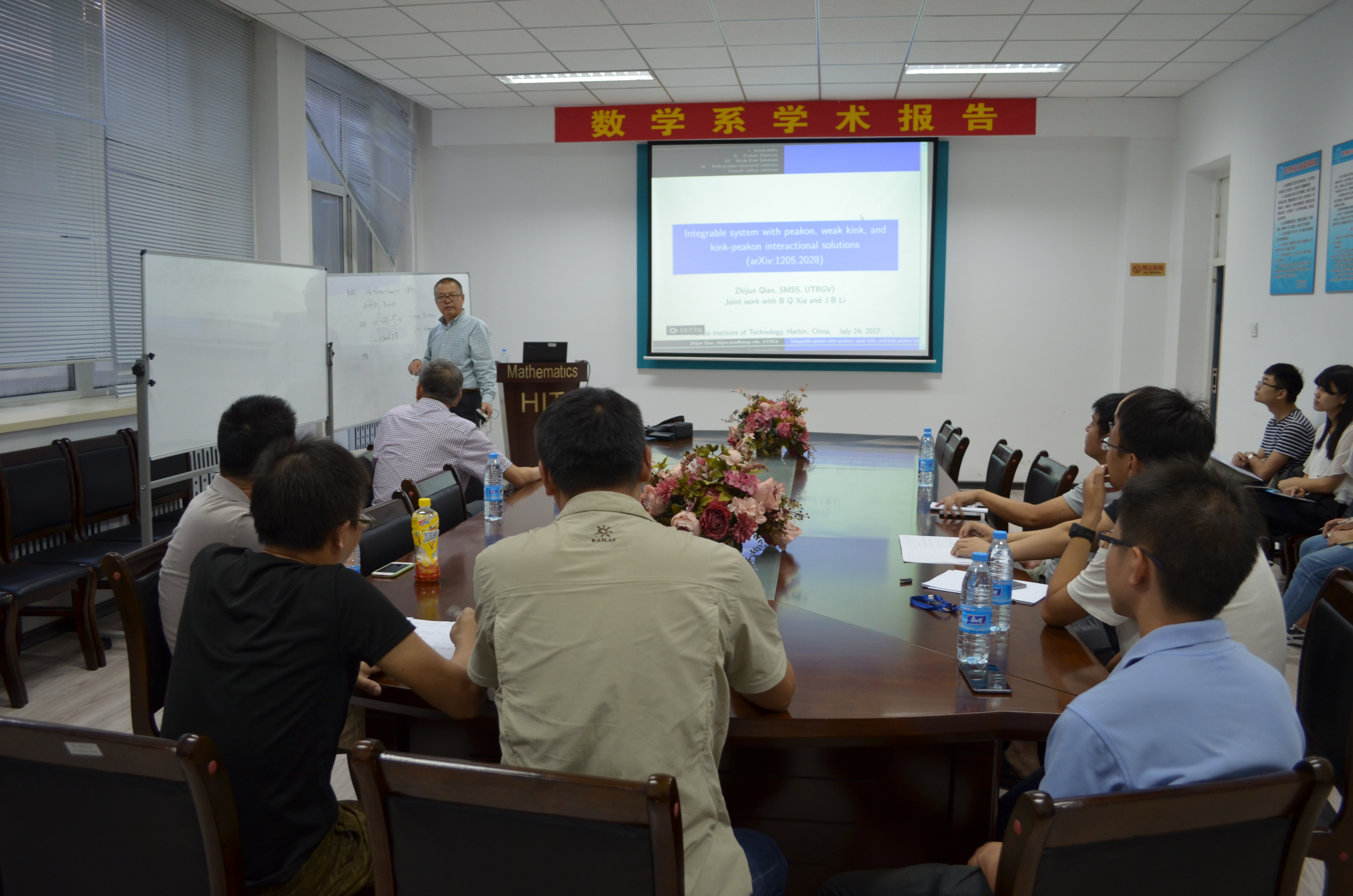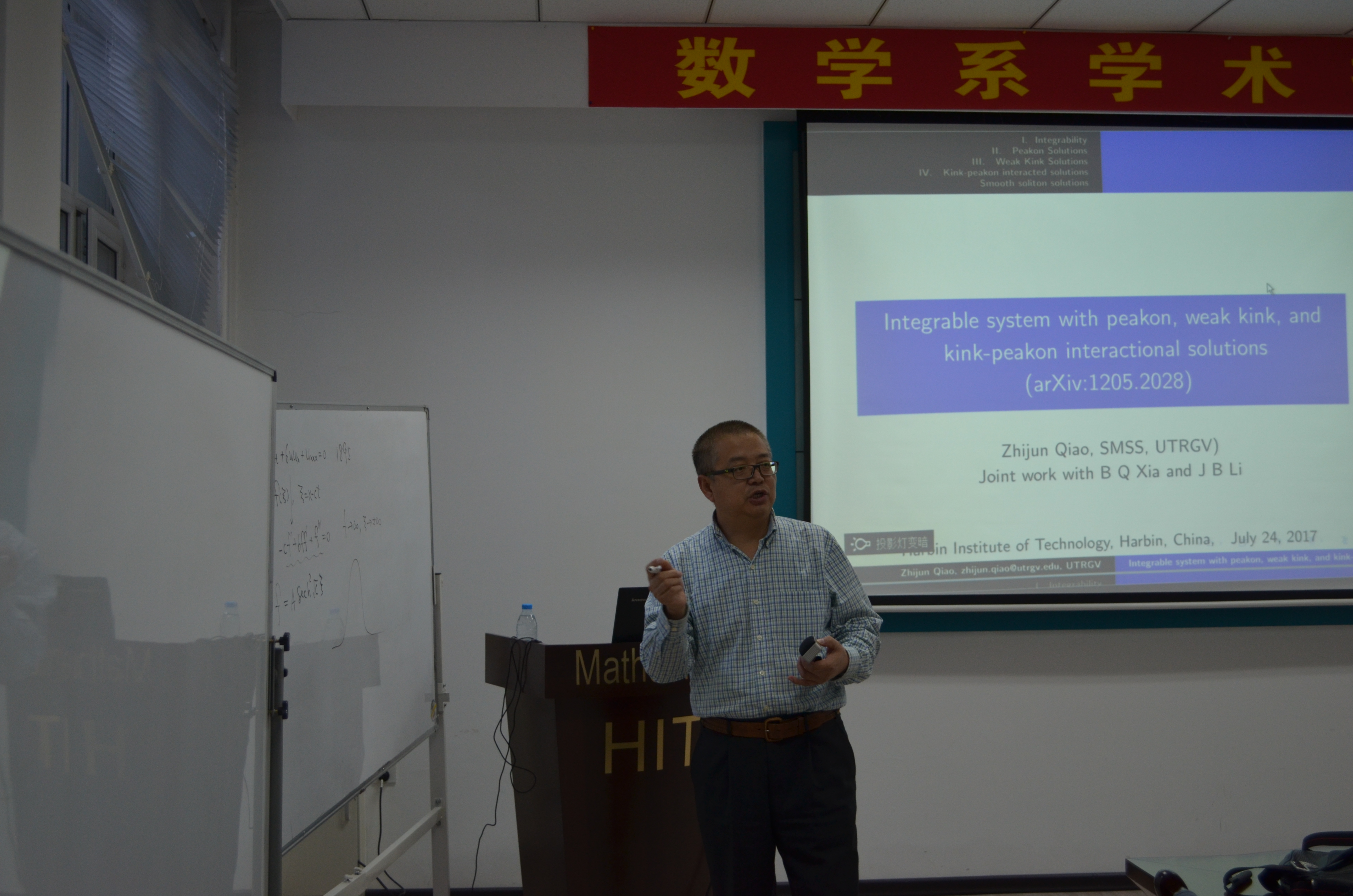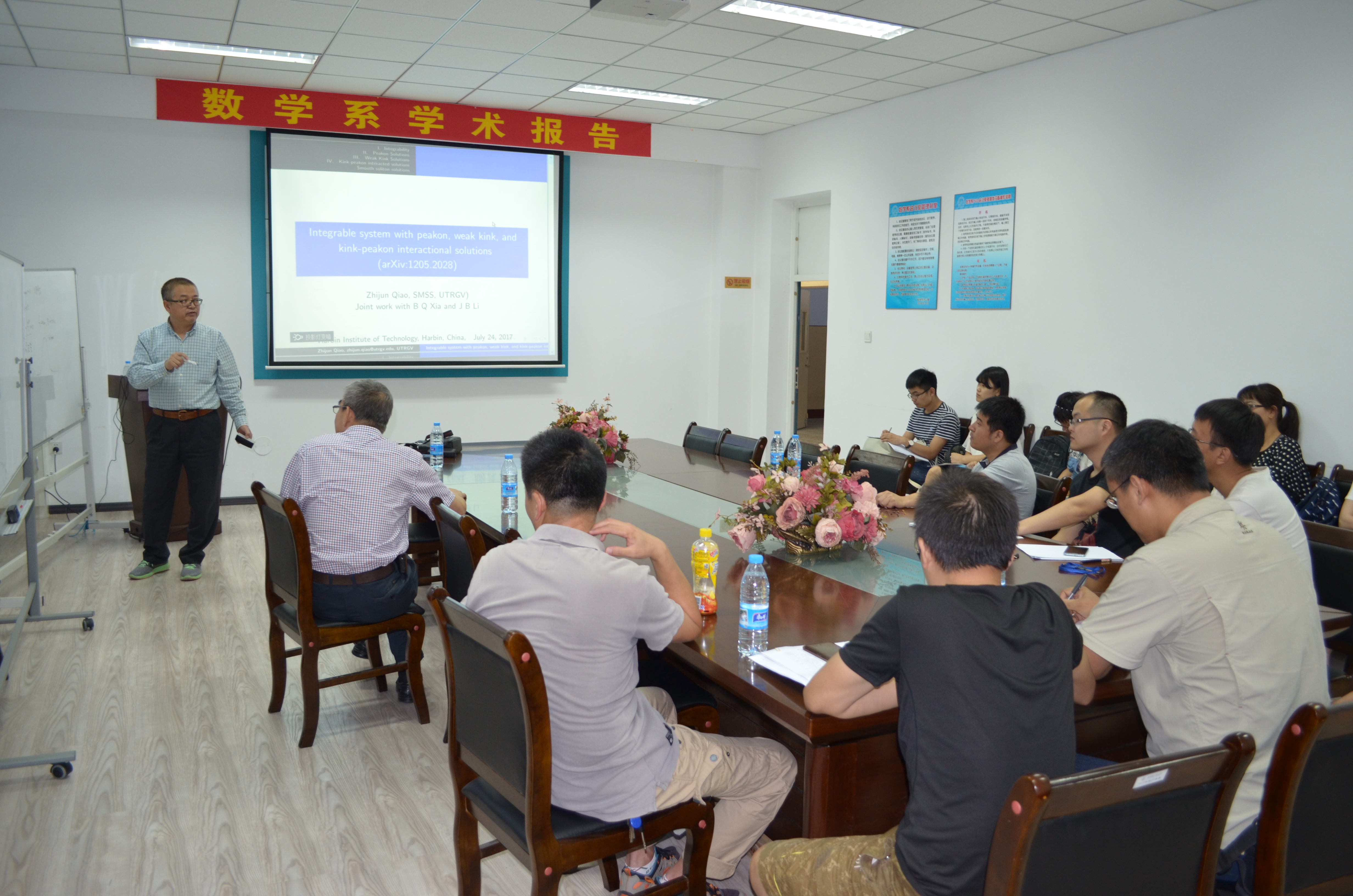 应数学系薛小平教授邀请,美国德克萨斯大学乔志军教授于7月25日访问必赢bwin线路检测中心官网数学系,并作题目为:Integrable system with peakon, weak kink, and kink-peakon interactional solutions的报告。乔教授在报告中向大家介绍了一类非线性偏微分方程,此类方程是可积系统,带有Lax-pair和bi-Hamiltonian结构。该报告向大家介绍了此类方程的一些显式解:带有尖点的孤立子解、多个孤立子、一类新的扭结解。此外,乔教授也对多个孤立子之间的相互作用进行了研究。该报告由薛小平教授主持,相关专业的多位师生参与了讲座,并对讲座内容展开了热烈的讨论。乔教授的报告深入浅出,得到了大家的一致好评。