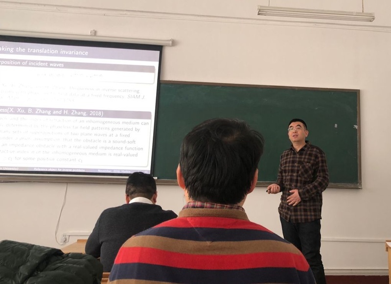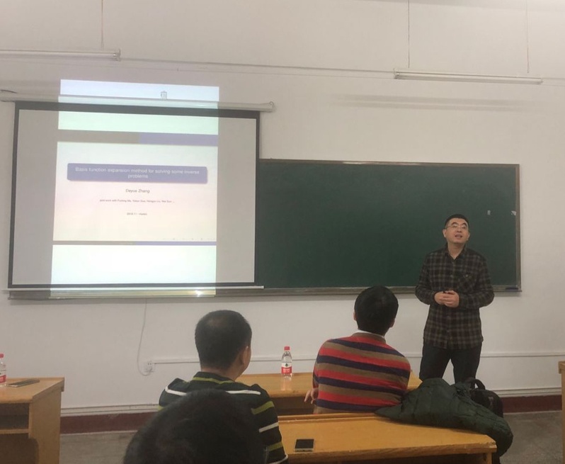 应数学系郭玉坤副教授的邀请,吉林大学必赢bwin线路检测中心官网张德悦教授于2018年11月18日至20日到我校进行学术访问。张德悦教授分别于18日下午14:00-15:00和20日上午9:00-10:00在格物楼522报告厅做了两场学术讲座,报告内容涉及声波反散射问题、无相位数据问题的参考球技术、以及基函数展开法求解反问题的算法框架及其应用等课题。报告由郭玉坤副教授主持,数学系相关方向的师生参加了报告会并与张德悦教授进行了热烈的学术交流与讨论。