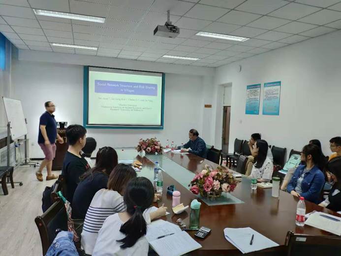 第二场报告时间为6月4日下午14:00-17:00,地点为格物楼503室,共有两个报告“Social Network Structure and Risk Sharing in Villages”和“Analysis of the Relationship Between Health and Socioeconomic Status to Inform Development of Loadings and Risk-adjustment Approaches for Current and Future Funding Models”,杨欧研究员的这两个报告围绕着社交网络结构对当前人民生活状况的影响,采用统计和计量经济模型进行建模,依据变系数损失函数模型进行了分析,并对变系数系统做了深入的阐述。