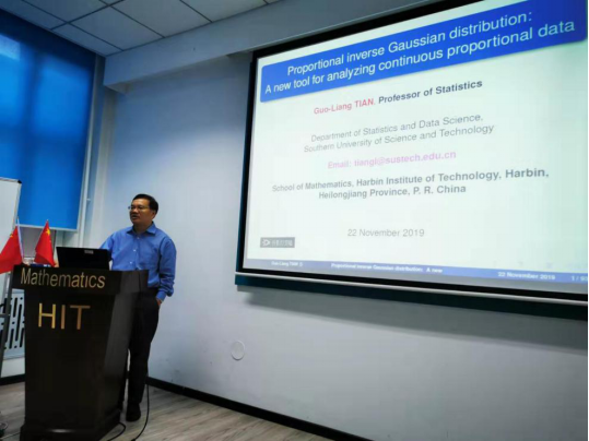 应必赢bwin线路检测中心官网田波平教授邀请,2019年11月22日上午,南方科技大学统计与数据科学系田国梁教授到访我校并作学术报告。田国梁教授在格物楼503报告厅为大家带来题为“Proportional inverseGaussian distribution: A new tool for analyzing continuous proportional data”的精彩学术报告。学院近30余名师生参与了此次报告会。