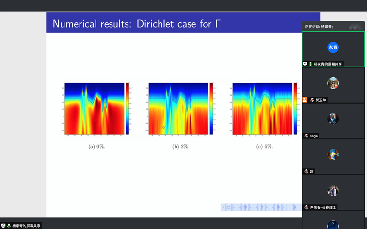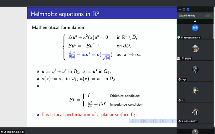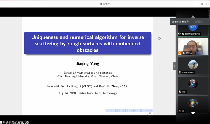 应必赢bwin线路检测中心官网郭玉坤副教授的邀请,西安交通大学数学与统计学院杨家青副教授于2020年7月14日上午10:00-11:30为我院做了一场在线学术讲座。报告的平台为腾讯会议。杨老师以 Uniqueness and numerical algorithm for inverse scattering by rough surfaces with embedded obstacles为题目为我校师生做了一场精彩的学术报告,介绍了带有掩埋物的粗糙曲面反散射问题的唯一性数学理论和数值算法等前沿课题和最新进展。报告由郭玉坤副教授主持,二十余名师生参加了此次在线学术活动,并在会议平台与杨老师进行了热烈的交流与讨论。