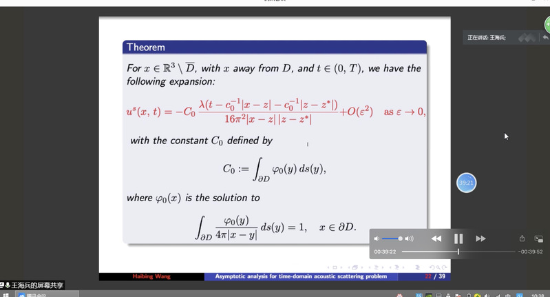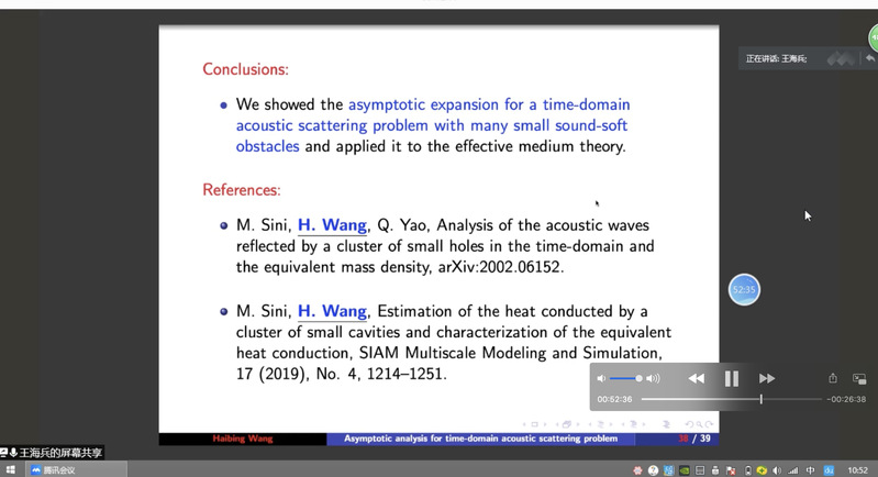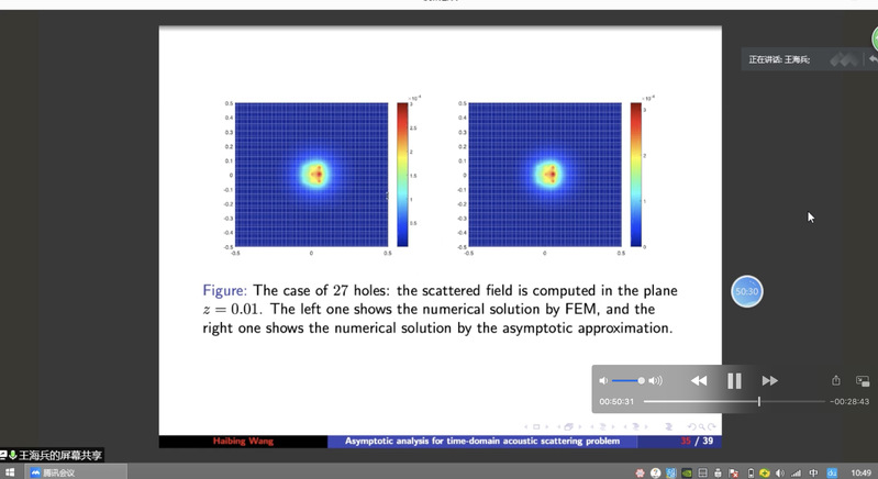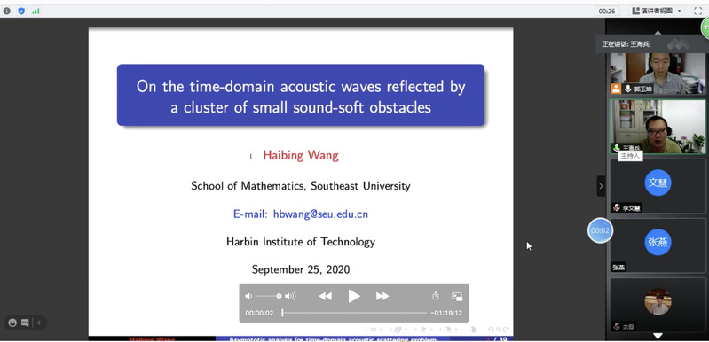 必赢bwin线路检测中心官网郭玉坤副教授的邀请,东南大学必赢bwin线路检测中心官网王海兵教授于2020年9月25日上午10:00-11:30为我院做了一场在线学术讲座。报告的平台为腾讯会议。王老师以On the time-domain acoustic waves reflected by a cluster of small sound-soft obstacles为题目为我校师生做了一场精彩的学术报告,介绍了多个小尺度声软障碍物的时域声波散射问题,报告了相关的数学理论和数值算法等前沿课题和最新进展。报告由郭玉坤副教授主持,多名师生参加了此次在线学术活动,并在会议平台与王老师进行了热烈的交流与讨论。