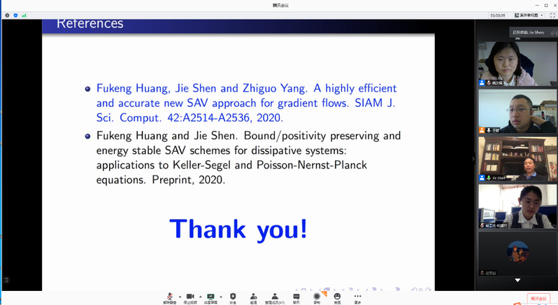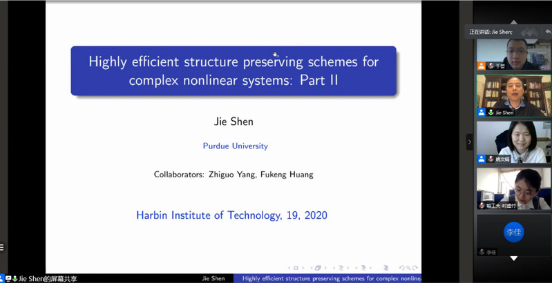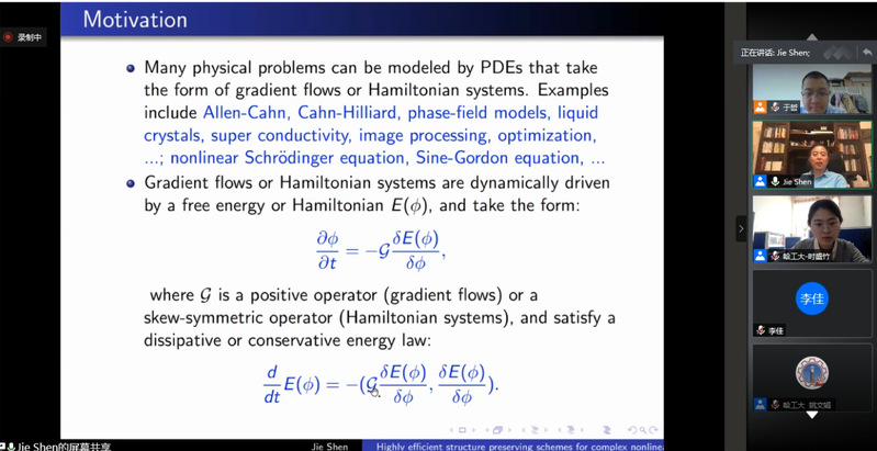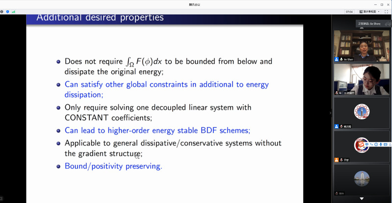 应必赢bwin线路检测中心官网计算数学系的邀请,美国普渡大学与厦门大学应用与计算数学中心主任沈捷教授于2020年10月12日上午8:00-11:30及2020年10月19日上午8:00-11:30为我院做了四场在线学术讲座。报告的平台为腾讯会议。沈捷教授以Highly efficient structure preserving schemes for complex nonlinear systems和Highly efficient and accurate structure preserving schemes for complex nonlinear systems为题目为我校师生共做了四场精彩的学术报告,介绍了流体力学中高效快速无条件稳定数值算法及其发展,给出了相关数值算例与数值模拟等实际应用。报告由姚文娟老师主持,必赢bwin线路检测中心官网近70名师生参加了该系列在线学术活动,并在会议平台与沈教授进行了热烈的交流与讨论。