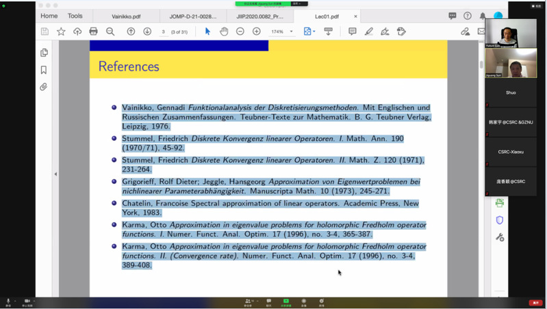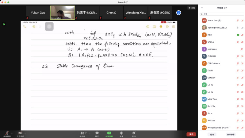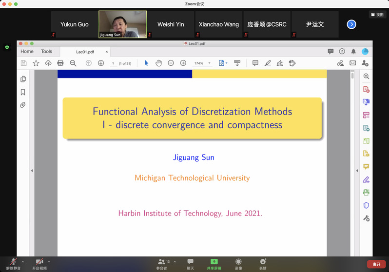 受我校国际项目管理中心资助,应必赢bwin线路检测中心官网郭玉坤副教授的邀请,美国密歇根理工大学数学系孙继广教授分别于2021年6月15-18日上午9:00-10:30为我院做了四场精彩的在线学术讲座。报告的平台为ZOOM会议。孙老师报告的主题为Functional Analysis of Discretization Methods,报告系统介绍了离散化方法的泛函分析理论,详细讲解了其理论基础和应用。报告由郭玉坤副教授主持,我院多名师生参加了此次在线学术活动,并在会议平台与孙老师进行了热烈的交流与讨论。