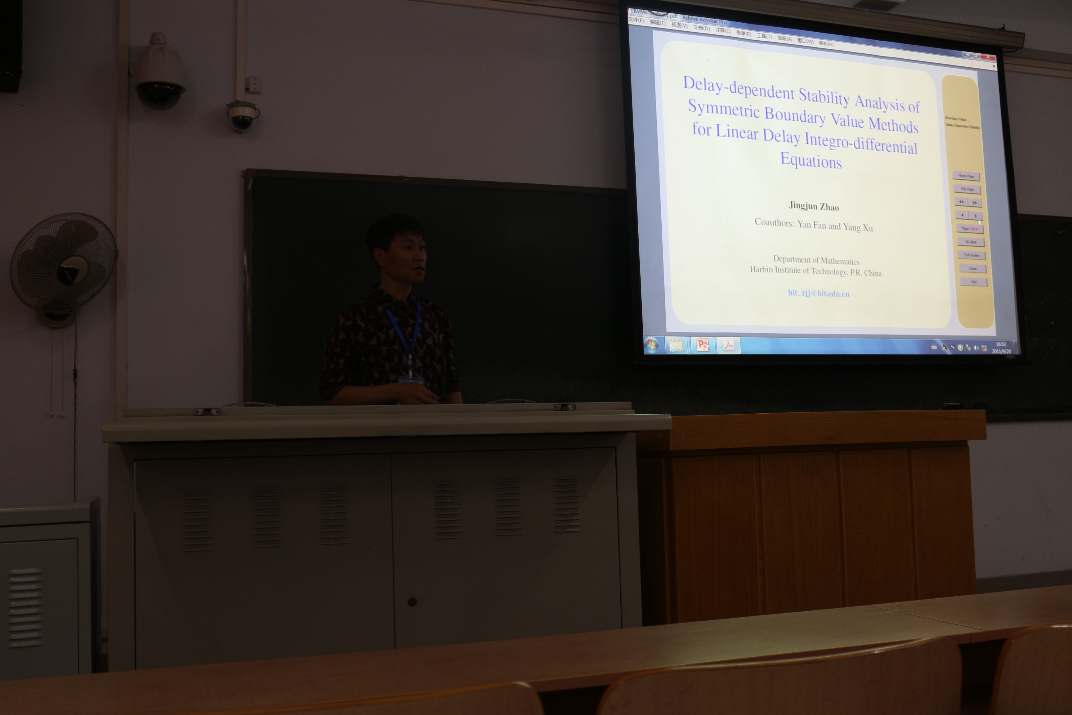 分组报告包含以下主题: 数学物理(含分析、方程、拓扑等)、几何、代数、应用数学、计算与优化。 我系共有2位教授应邀做了分组邀请报告,其中赵景军教授在会议上做了题为“Delay-Dependent Stability Analysis of Symmetric Boundary Value Methods for Linear Delay Integro-Differential Equations”的“计算与优化”分组邀请报告,陈胜教授做了题为“Applications of Theory of Matrix Canonical Forms in Graphs theory”的“代数”分组邀请报告。