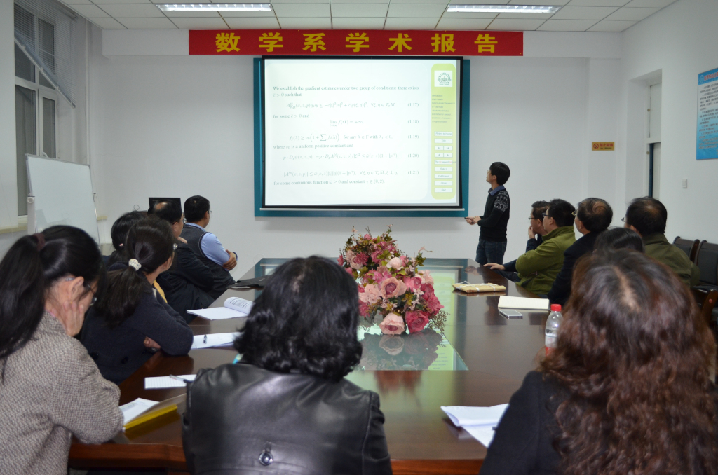 2014年10月17日下午16:00时,我校数学系概率统计与运筹控制研究所教师矫贺明在格物楼503做了题为 《Regularity for an obstacle problem of Hessian equations on Riemannian manifolds》的学术报告,报告由数学系包革军教授主持。数学系二十余位师生听取了学术报告并进行了热烈讨论。