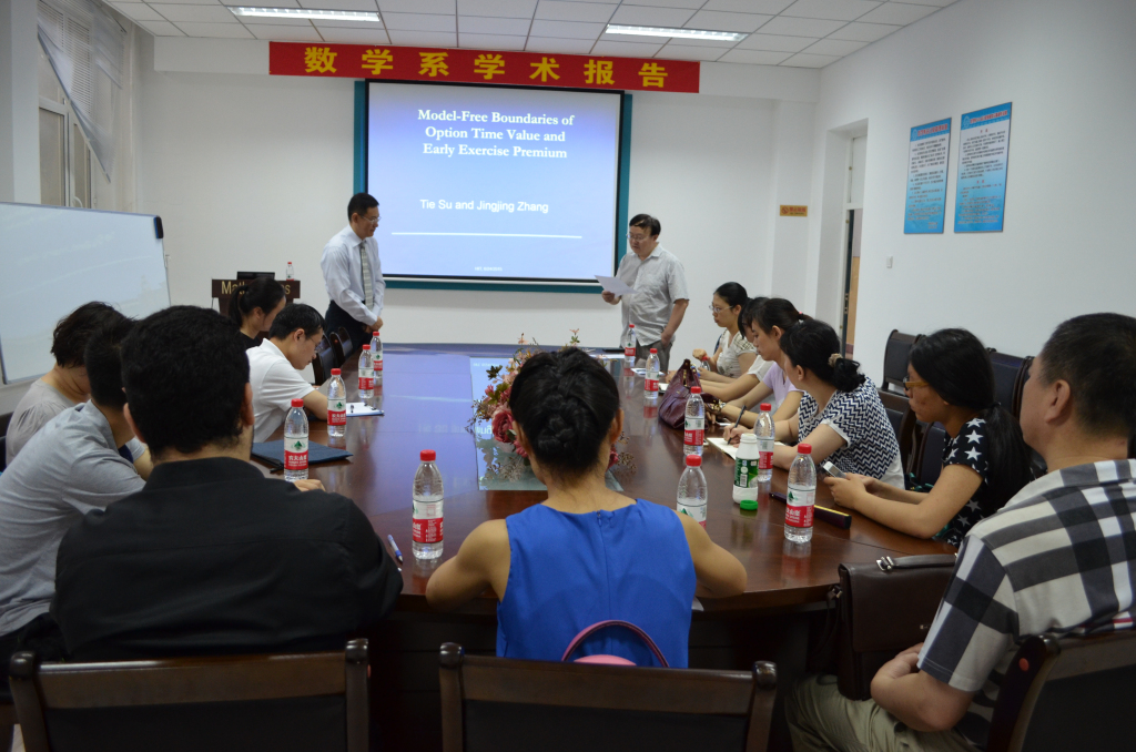 2015年6月24日-25日,美国迈阿密大学金融学(University of Miami )教授宿铁老师在数学系会议室共做了四场精彩的学术报告,报告由田波平教授主持,数学系十余位师生听取了报告并就相关问题进行了探讨,现场气氛十分热烈!