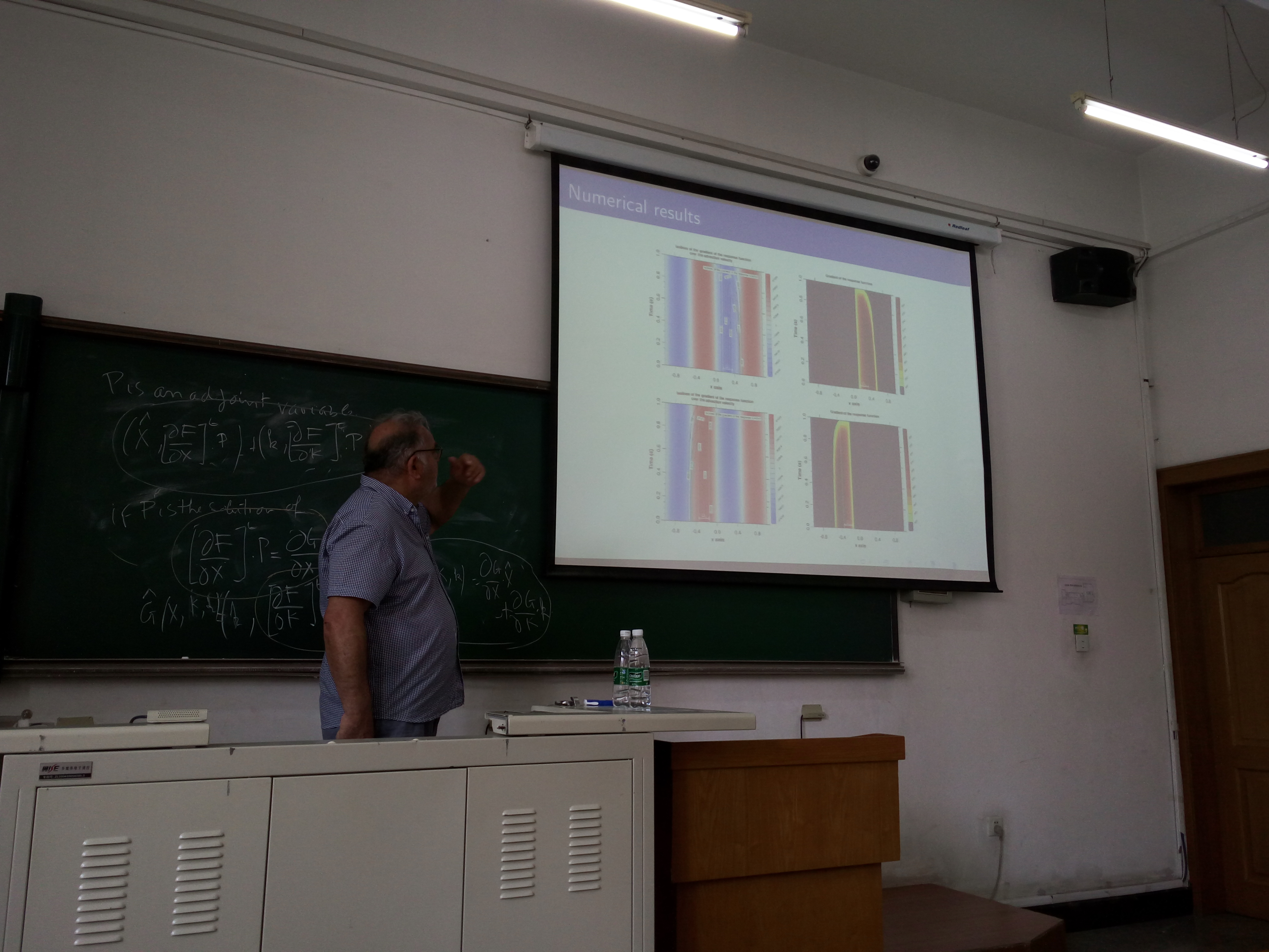 2016年6月20日上午,法国Grenoble第一大学数学系Francois-Xavier Le Dimet教授在诚意楼103连续做了三场精彩的报告,报告题目为《Introduction to Data Assimilation》《Sensitivity and Error Propagation》《Variational Methods for Sensitivity Analysis and Parameter Estimation in Hydrology》,数学系十余位师生听取了报告并进行了热烈的讨论。