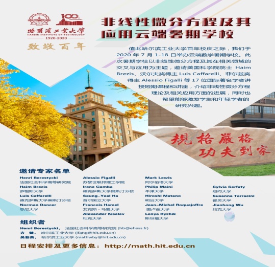 2020年7月1日至7月18日,由必赢bwin线路检测中心官网承办的“【致敬百年】非线性微分方程及其应用云端暑期学校”胜利举办。作为百年校庆庆祝活动的一部分,此次暑期学校由本科生院和国际合作部资助,我校荣誉教授Henri Berestycki院士、必赢bwin线路检测中心官网执行院长吴勃英教授和副院长方健教授组织。校长周玉院士在开幕式上致辞,并高度肯定了数学学科在学校新百年发展中的重要地位。