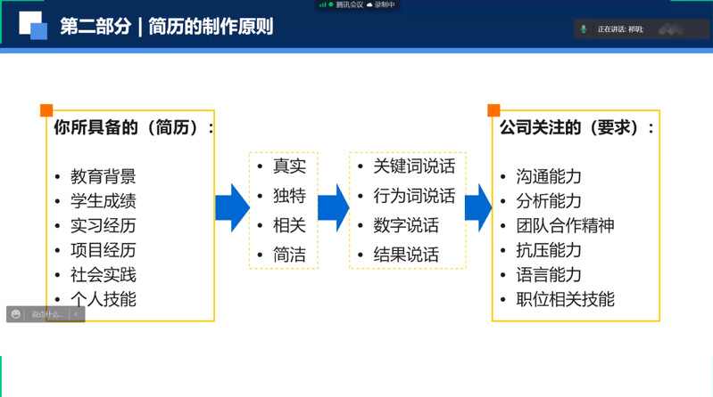 首先,祁玥老师针对简历的结构和制作原则进行介绍。从学生具备的资质与能力出发,强调简历内容应围绕公司的职业需求,指导学生在简历中用关键词、行为词、数据和结果对自己的能力与经历进行描述。随后,祁玥老师通过讲授法和案例分享,详细介绍了简历各部分制作技巧。指导学生运用“PAR”原则和专业术语阐述实习实践经历,提高能力认可度。最后,祁玥老师就如何在简历中弥补劣势、简历投递等方面进行介绍。她表示,要善于发现和挖掘自身闪光点,以更加自信、严谨的态度面对就业。希望同学们积极投身国家重点领域,努力成为社会主义合格建设者和可靠接班人!
