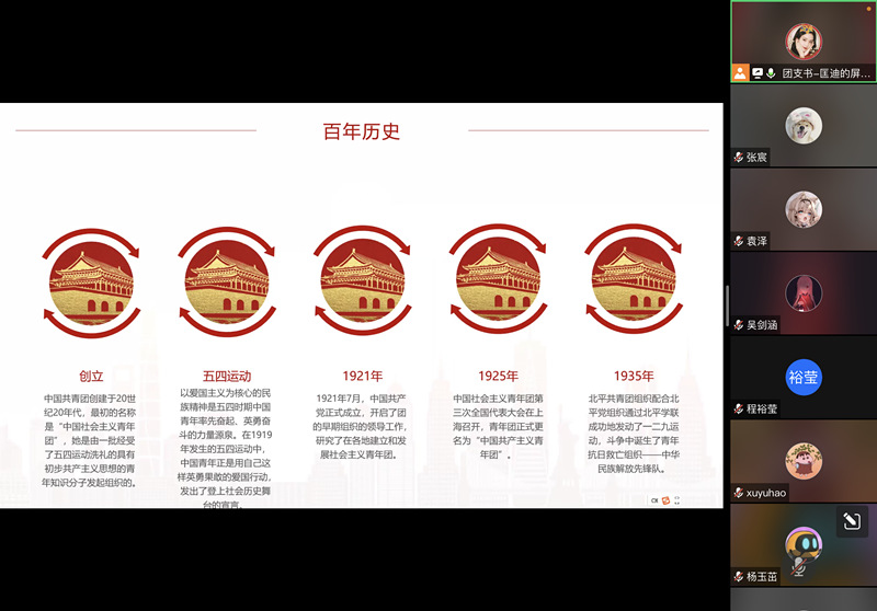 首先,匡迪同学通过观看视频与团课讲授的方式带领同学们回顾了共青团百年历史,她引用习近平总书记的话说道:共青团百年历史波澜壮阔,百年初心历久弥坚。中国共产主义青年团自创立之初为拯救中华民族、开辟新的革命道路付出了巨大的牺牲。新中国成立以来,代代有志青年时刻追随党的步伐,奋发图强,为社会主义建设贡献力量。时至今日,我辈青年共青团员,要继承和发扬共青团的优良传统,不断增进对习近平总书记和党中央的认同与追随。
