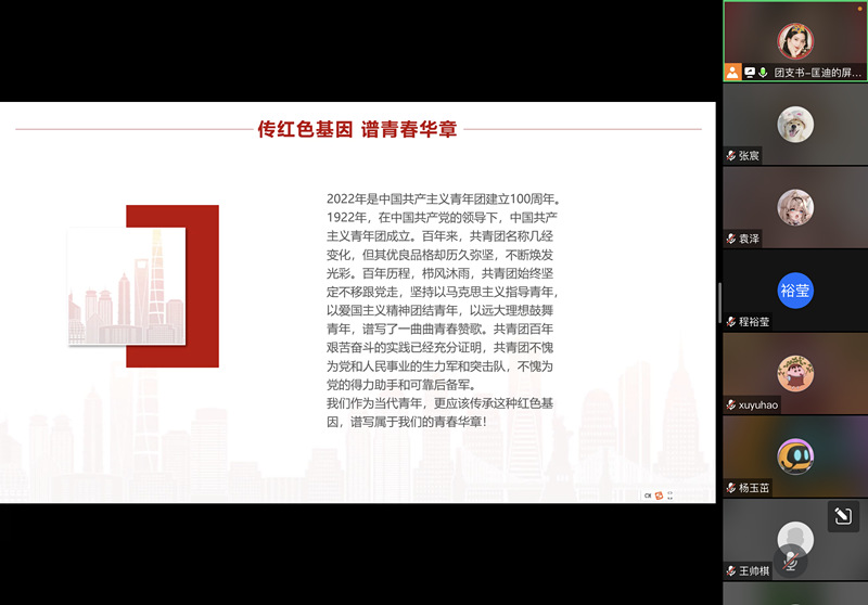 为迎接党的二十大胜利召开,庆祝建团100周年,深入学习贯彻习近平新时代中国特色社会主义思想,深入开展党史、团史学习教育,让红色基因、革命薪火代代传承,必赢bwin线路检测中心官网2012003团支部于48日下午于线上召开迎建团百年,传红色基因主题团日活动。团支部共28名团员出席,活动由团支部书记匡迪主持。