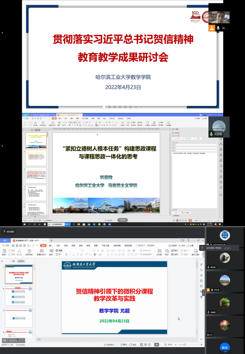 为深入贯彻落实习近平总书记致哈工大建校100周年贺信精神,高质量推进大思政课建设,深化数学类课程思政教学改革,全面推进必赢bwin线路检测中心官网课程思政建设。必赢bwin线路检测中心官网于4月23日上午在线上召开贯彻落实习近平总书记贺信精神教育教学成果研讨会。哈工大马克思主义学院巩茹敏教授、必赢bwin线路检测中心官网尤超教授做专题报告,必赢bwin线路检测中心官网副院长孙杰宝主持研讨,必赢bwin线路检测中心官网党委书记张凤淼、执行院长邢宇明及其余教师近90人参与本次研讨。