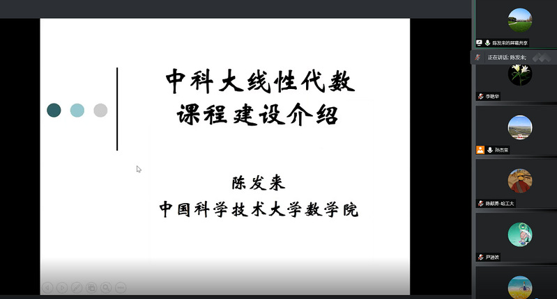 交流会上,中国科学技术大学数学科学学院副院长王毅教授就数学公共基础课程作了整体性介绍。国家教学名师陈发来教授针对线性代数课程做了相关具体介绍,并与代数与几何教学团队展开了深入的研讨。安徽省教学名师李平教授就微积分课程设置、助教、习题课、大学生数学竞赛、以及新教师培训等问题与我校微积分教学团队进行了广泛而深入的交流。