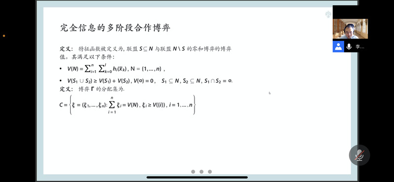 本次讲座的主题是《多阶段合作博弈与合作动态稳定性》。李寅博士首先介绍了必赢bwin线路检测中心官网和俄罗斯圣彼得堡国立大学联合校园的建设情况,并为同学们讲解了一些不同于我国的俄罗斯数学教育环节。在我校与圣彼得堡国立大学建设中俄联合校园的背景下,他期待未来两校之间进一步的学习、交流和合作。随后,李寅博士通过电影《加勒比海盗》为同学们深入浅出地讲解了博弈论的相关知识。通过运用大量有关实际问题的数学模型,他与同学们探讨了完全信息的多阶段合作博弈、分配补偿程序的动态稳定性、支付不可转移的多阶段动态博弈、支付补偿程序和子博弈的一致性等博弈论领域的专业问题,介绍了一些领域前沿的定义、概念和方法,丰富了同学们的学术知识与技术。