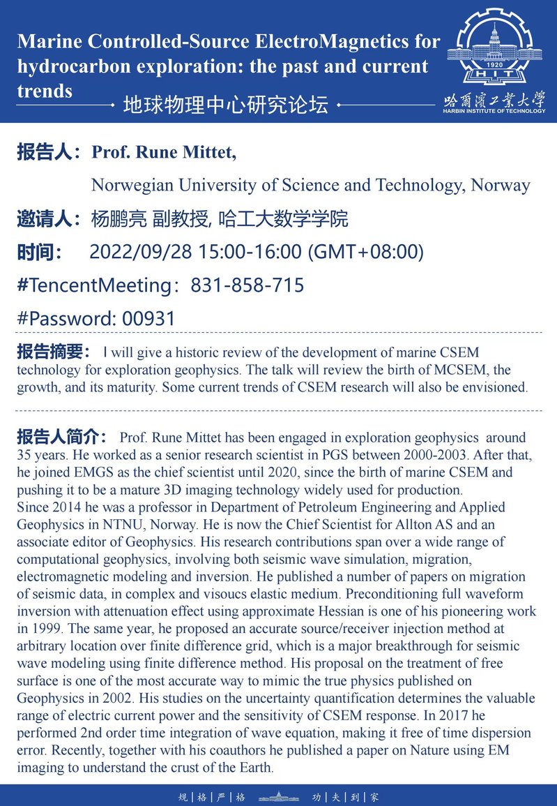 挪威科技大学Rune Mittet教授关于海洋电磁勘探技术的学术报告通知